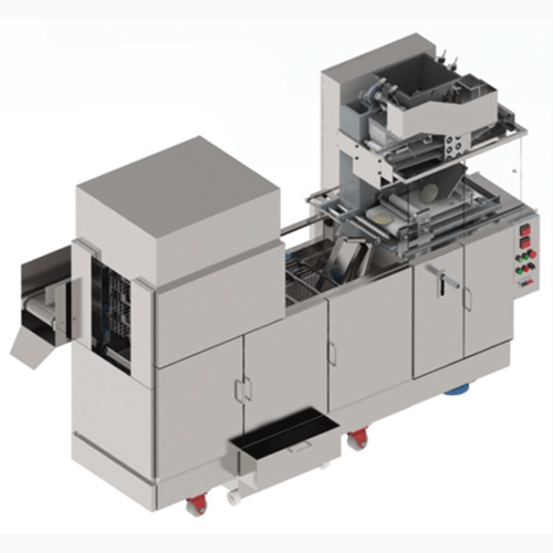 FIRST AUTOMATIC COMPACT, SINGLE UNIT MACHINE TO PRODUCE STUFFED AND LAYRED (LACHHA) PARATHAS IN MOST HYGIENIC WAY. BEST SUITED INDUSTRIAL, CANTEENS, LANGARS, HOSTELS, RAILWAYS & DEFENCE ESTABLISHMENTS. THE STUFFED OR LAYRED BALLS ARE MANUALY PUT ON THE MACHINE CONVEYOR WHICH TAKES THEM TO PRESSING STATION WHERE THEY ARE PRESSED TO MAKE ROUND PRATHAS. THESE PRATHAS TRAVEL ON DIFFRENT CONVEYORS FOR BAKING AND SHALOW OIL FRYING ON BOTH SIDES.